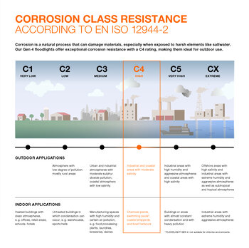 The FLOODLIGHT GEN 4 range offers exceptional corrosion resistance with a C4 rating, making them ideal for outdoor use.