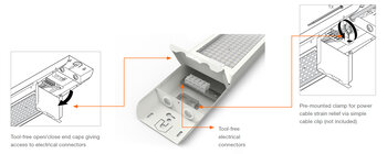 The end caps can be opened and the electrical wiring can be connected without any tools. And the pre-mounted clamp for