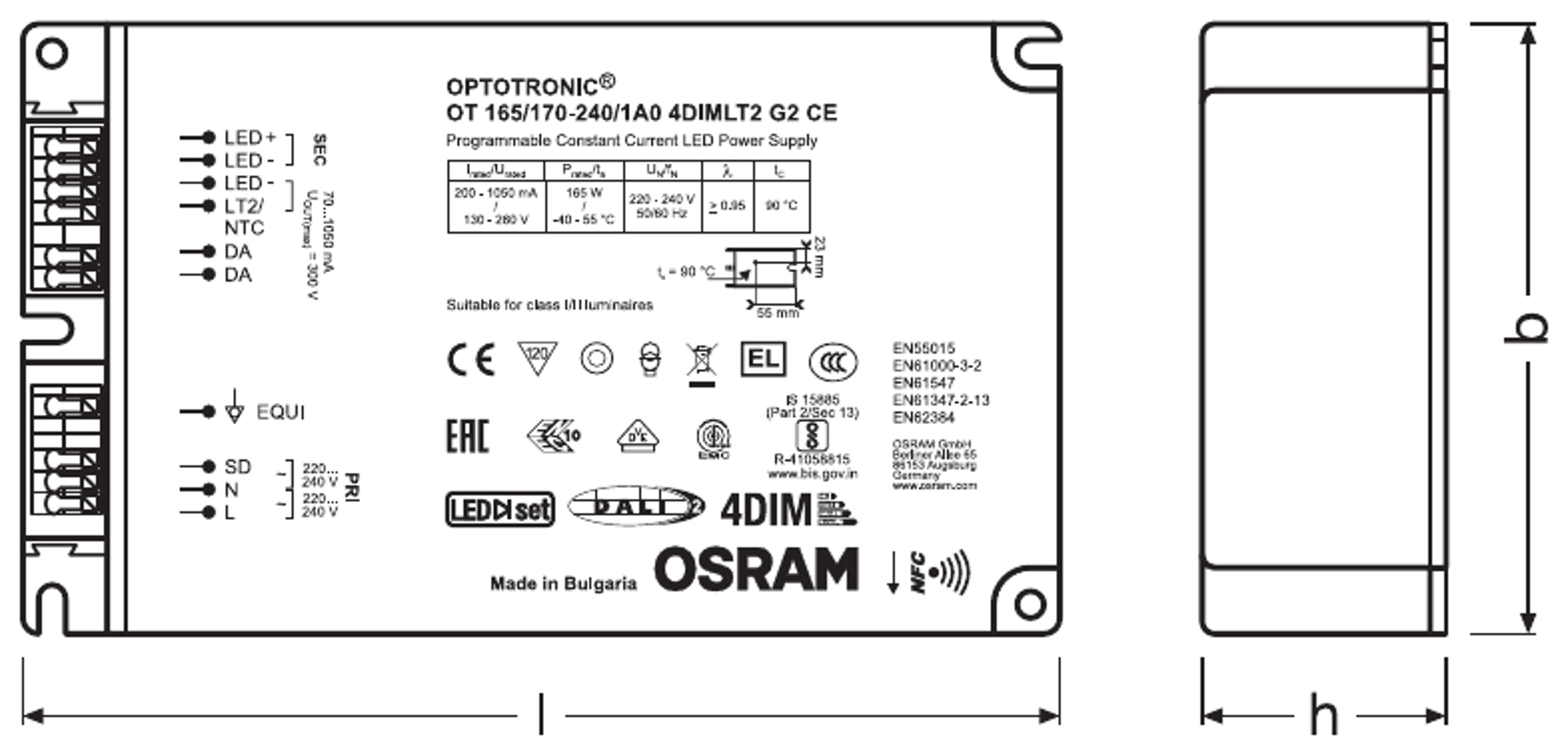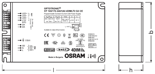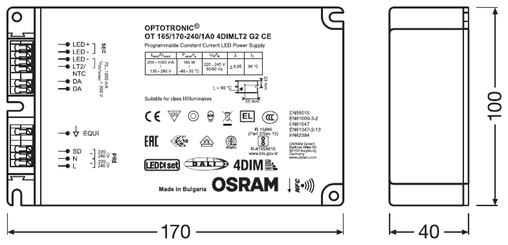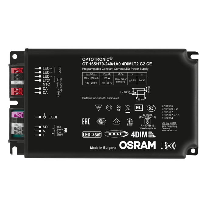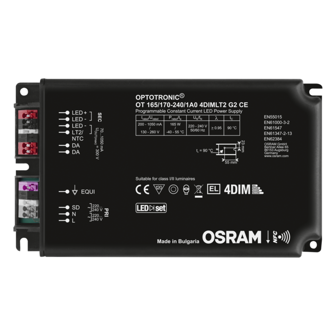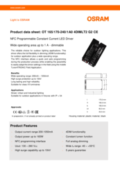 | Standardit | EN 61347-1:n mukaisesti, EN 61347-2-13:n mukaisesti, EN 62384:n mukaisesti, EN 55015:2006 + A1:2007 + A2:2009:n mukaisesti, EN 61547:n mukaisesti, FCC 47, osan 15, luokan B:n mukaisesti, IEC 61000-3-2:n mukaisesti, IEC 61000-3-3:n mukaisesti, IEC 62386-101:n mukaisesti, IEC 62386-102:n mukaisesti, IEC 62386-207:n mukaisesti, UL-8750 |